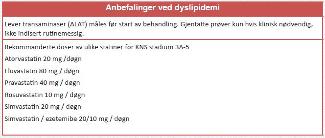 Statiner er førstelinjebehandling hos pasienter med KNS. Kombinasjonen simvastatin-ezetemibe 20/10 mg / døgn foretrekkes ved lavere grader av eGFR < 25ml. Dette er sannsynligvis tryggere behandling, grunnet risiko for økt toksisitet ved simvastatin 40 mg i monoterapi.